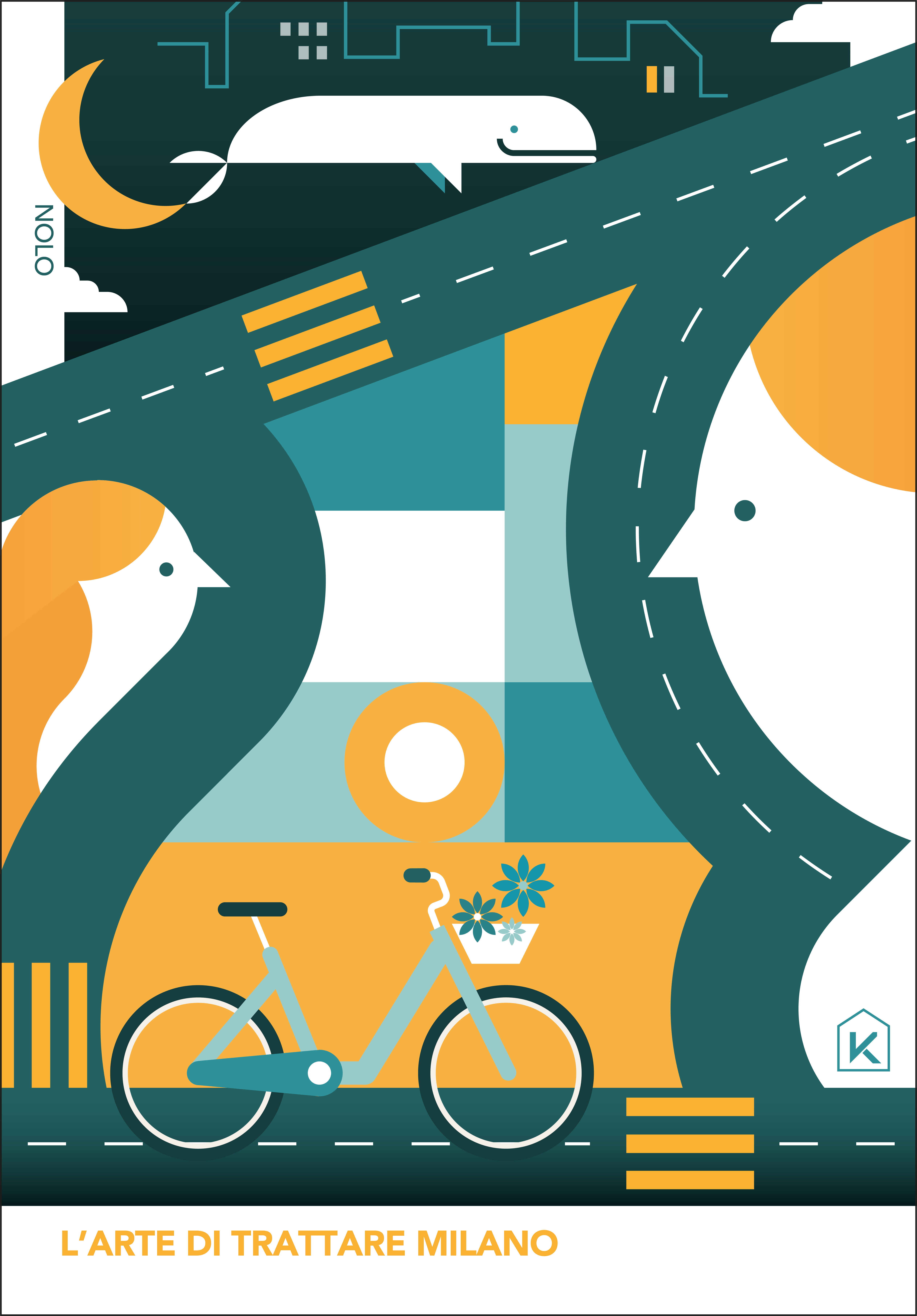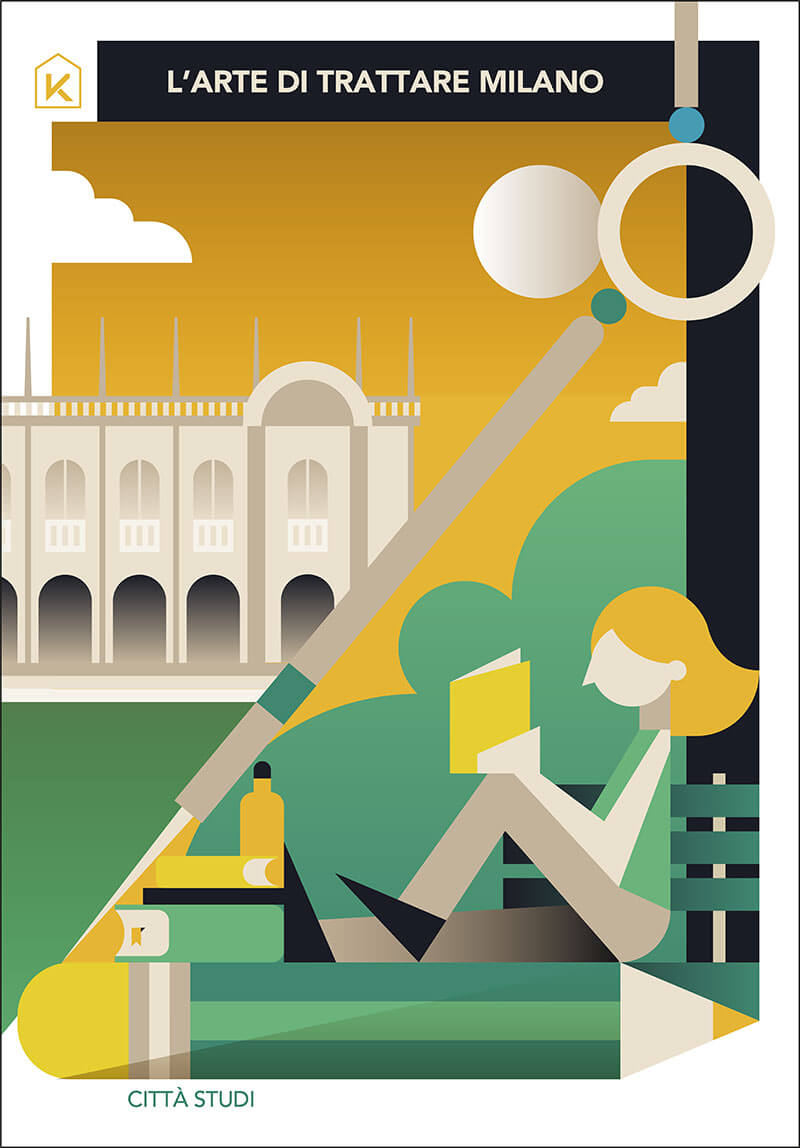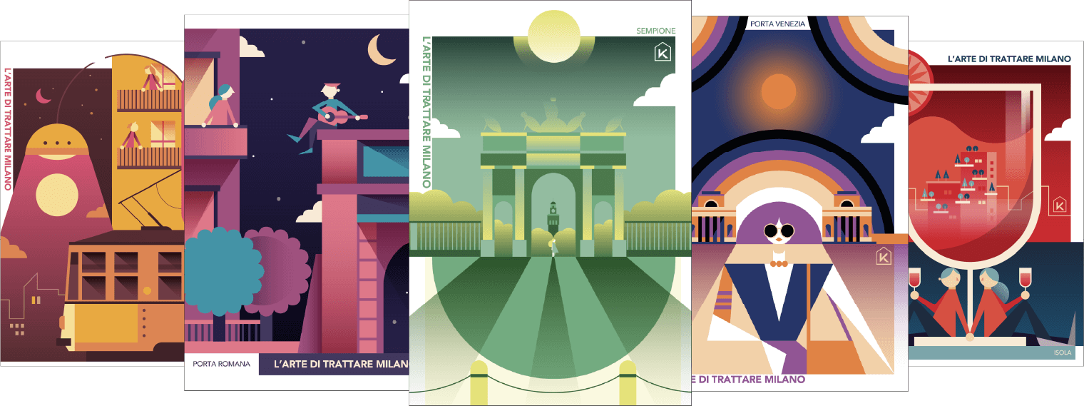 Un parallelismo insolito, che vuole sottolineare l’unicità di KERS nel porsi sul mercato dell’immobiliare. Il progetto vede alcune delle zone più suggestive di Milano contaminate dalle illustrazioni di Poroli, che le ha reinterpretate con il suo stile grafico eclettico, fatto di colori e geometrie.